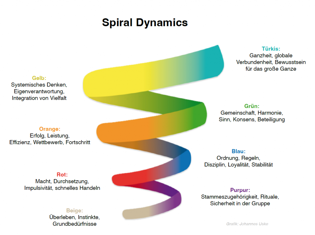 Doch damit bleibt eine wichtige Frage offen: Wie unterscheiden sich Menschen innerlich, und welche inneren Antriebe formen ihr Handeln? Hier kommt Spiral Dynamics ins Spiel — ein Modell, das erklärt, wie Werte, Weltbilder und Motive sich über Entwicklungsstufen entfalten. Spiral Dynamics wurde ursprünglich von Clare W. Graves entwickelt und später von Don Beck & Chris Cowan weitergeführt. In Ken Wilbers integraler Theorie fließen diese Stufen als „Levels“ (Entwicklungsebenen) ein — Spiral Dynamics ist also Teil der integralen Landkarte, nicht getrennt davon.