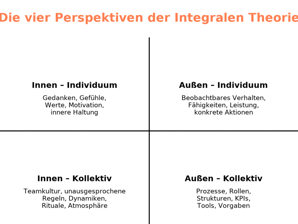 Die integrale Theorie (u.a. Ken Wilber) bietet eine Landkarte, um komplexe Situationen in ihrer Ganzheit zu verstehen und unpassende Lösungsansätze zu vermeiden. Sie unterscheidet vier Perspektiven oder Quadranten, die alle gleichzeitig wirken und berücksichtigt werden sollten: