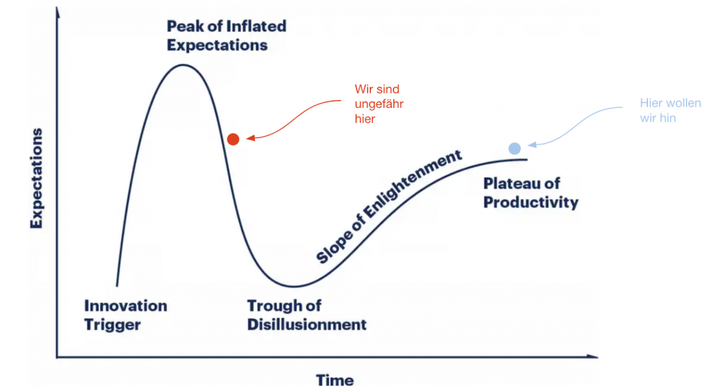 Ein Blick auf die Agenda brachte die erste Überraschung. Trotz ordentlicher Präsenz war AI nicht erdrückend dominant – für eine Architekturkonferenz zur aktuellen Zeit fast wohltuend. „Nur“ ungefähr jeder sechste Talk drehte sich explizit um die Themen AI, wobei natürlich sehr viele Sessions das Thema zumindest gestreift haben. Im Sprachgebrauch des Gartner Hype Cycle sind wir nun wohl endgültig über den Peak of Inflated Expectations hinaus und arbeiten uns langsam, aber sicher, hin zu wirklichen und nachhaltigen Use Cases.
