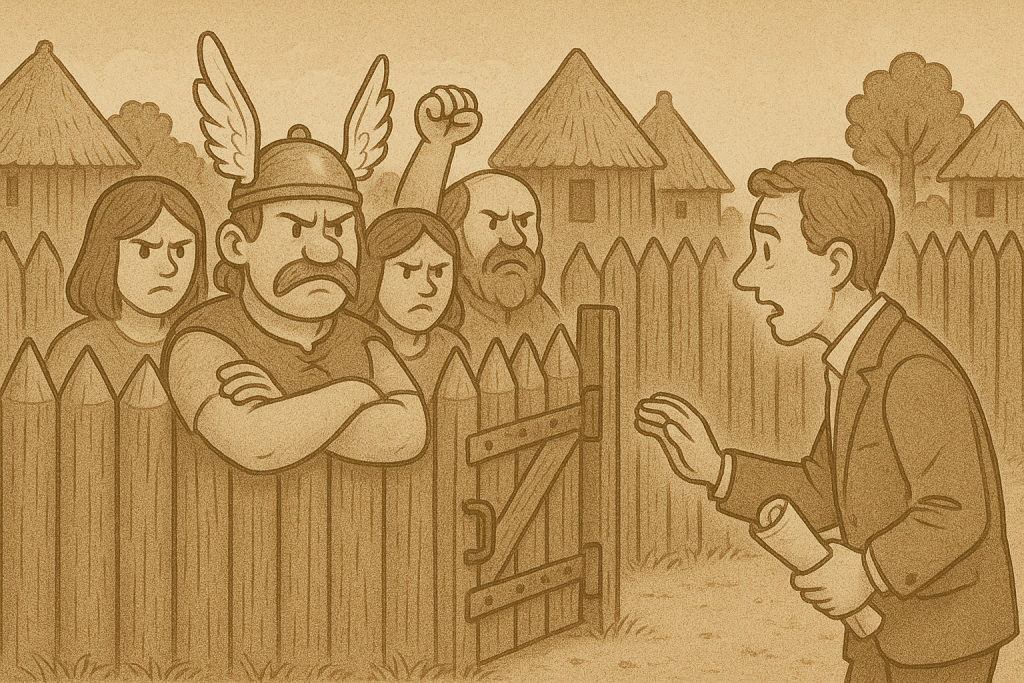 Ich denke manchmal an Asterix & Obelix, wenn ich manche Teams in ihren Retros beobachte. Da sitzt ein gallisches Dorf zusammen, kämpferisch, eng verbunden, voller Stolz auf die eigene Selbstorganisation. Und draußen lauert das Imperium: das Management, die Enterprise Architekten, die fremdbestimmten Roadmaps. Was als gesunder Schutzmechanismus beginnt, kann schnell zur systemischen Trennung werden.